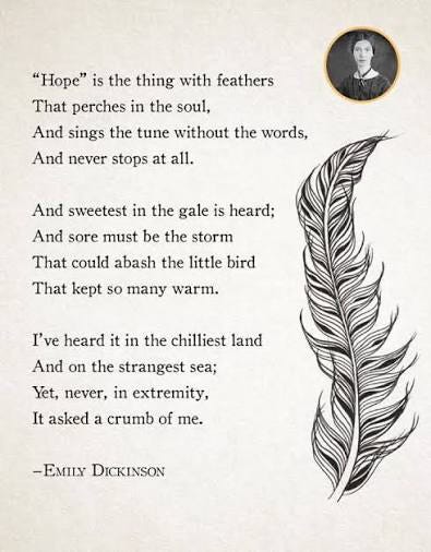 I was instantly attentive and sat forward in my seat and wanted to hear more. She said that the first Sunday of Advent was all about hope and there were two poems about hope she wanted to share with us. The first one was by Emily Dickinson and how hope is like a feather. It is a beautiful poem. Here it is for you to read: