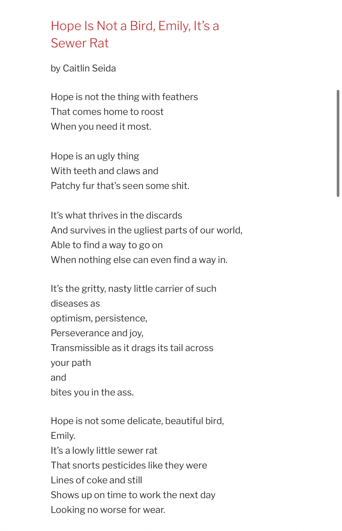 Rev. Lydia said that for a lot of people, this poem does provide strength during hard times but there was a different poem that actually meant more to her and shows the fierce nature of hope. She said she actually related to a different poem that was a bit edgier. This poem was written by Caitlin Seida called, “Hope is Not a Bird, Emily, It’s a Sewer Rat.” I wanted to share it here so you can read it.